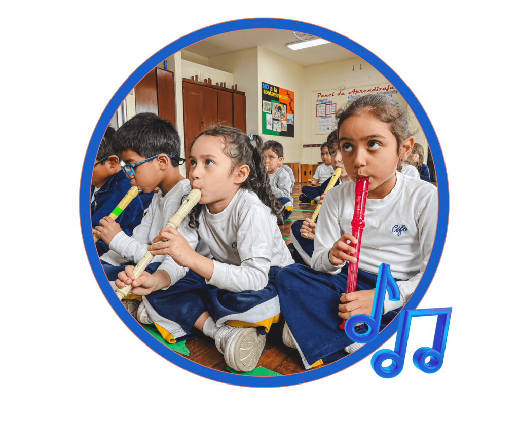 La música desarrolla la capacidad creadora y la expresividad a través del lenguaje musical. Contribuye en la formación de las diferentes inteligencias del niño/a: musical, emocional, lógica, espacial, lingüística, cinética corporal, Inter e intra-personal. Se busca que el niño adopte saberes y construya sus conocimientos que le permitirán conectarse con su yo interno y el mundo que lo rodea, sea con un instrumento o la propia voz.