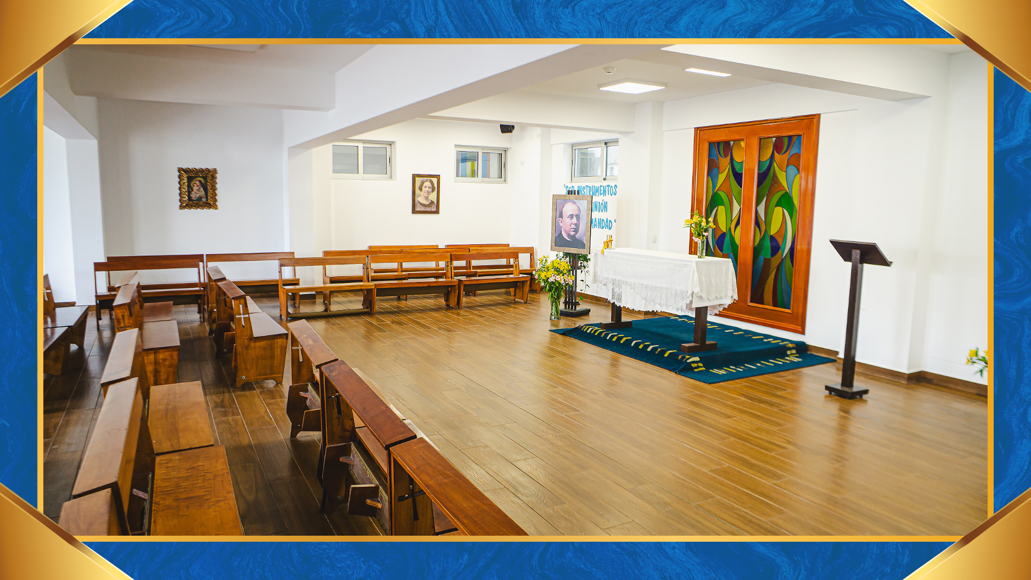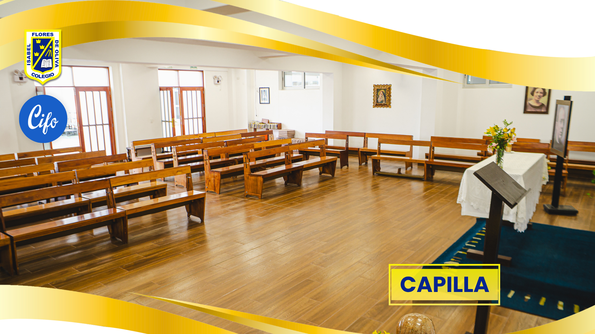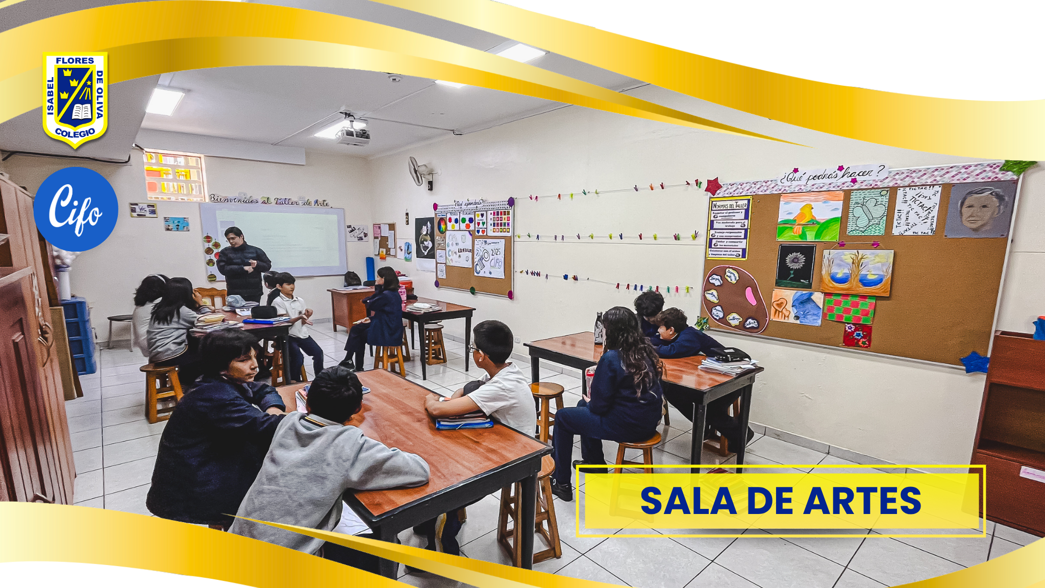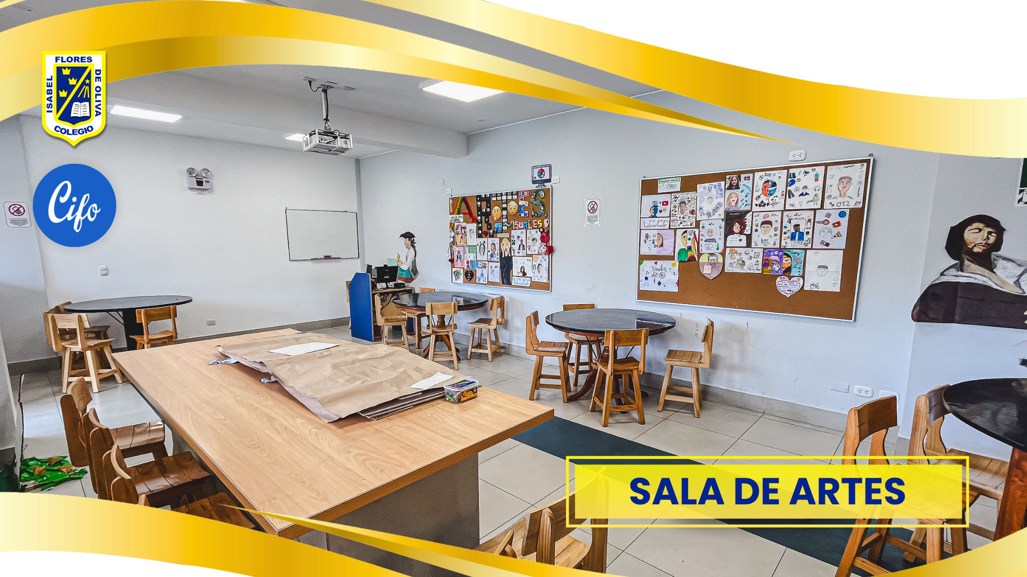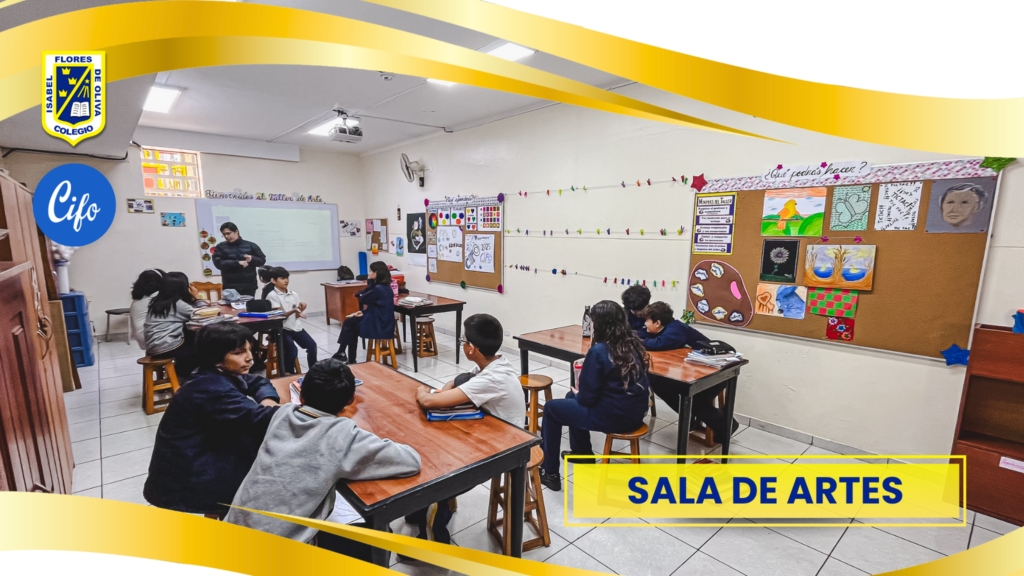 SALA DE ARTES PLÁSTICAS, equipado con mesas de trabajo, bancas, bodega y proyector multimedia, en cada nivel: Inicial, primaria, secundaria donde se desarrollan las clases de arte visual y plástica.